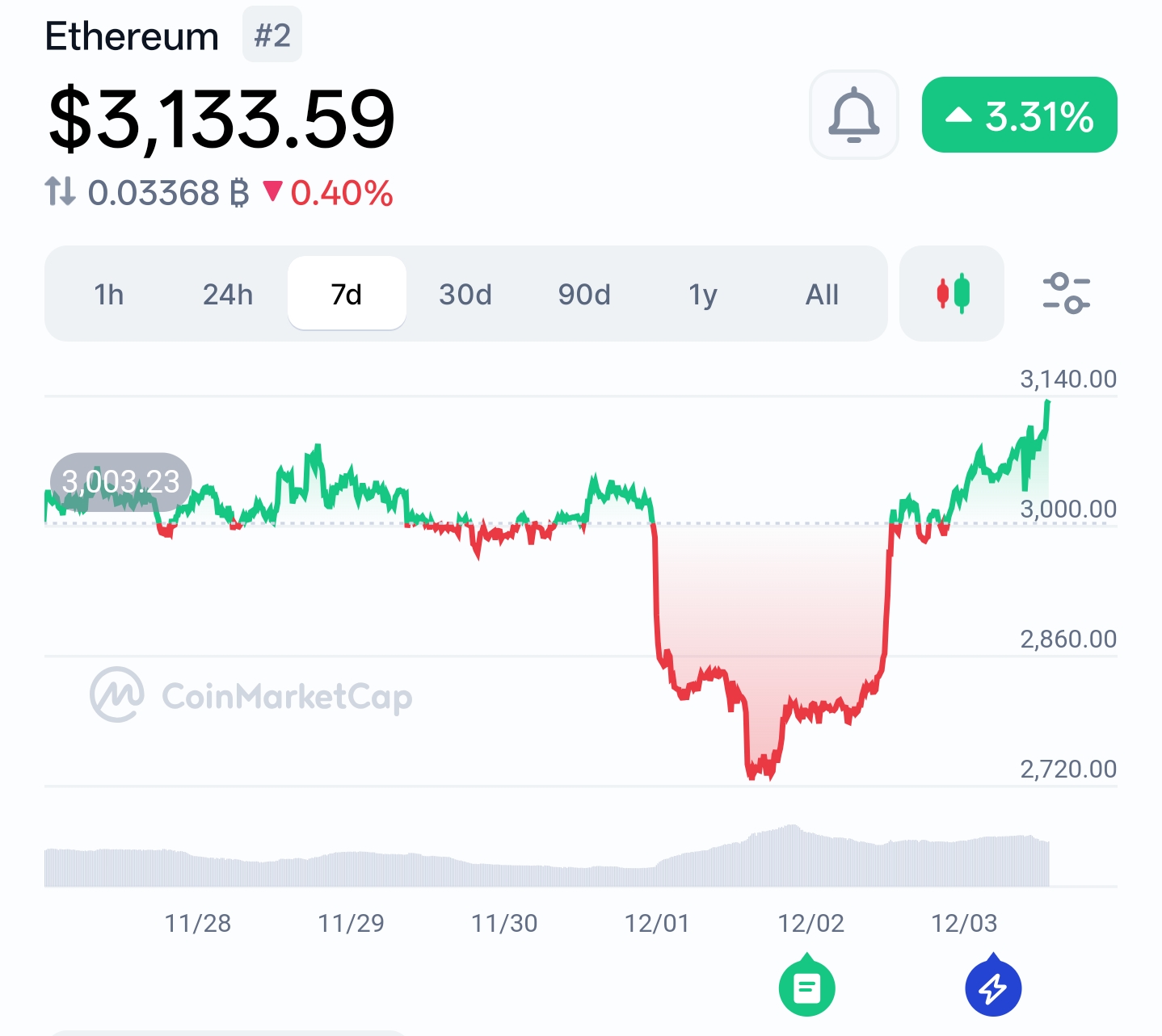 Have a look at the price chart for etherium coin and you will be able to see that there has been significant growth on the price in last 24 hours where I did was trading below 3000 US dollars and now all of the day it is about 3000 which I think is magical and this chart is clearly showing that there is demand for the coin in the market and it is not just Bitcoin and ether but other coins like xrp etc have shown good price recovery.